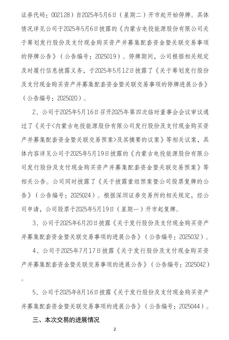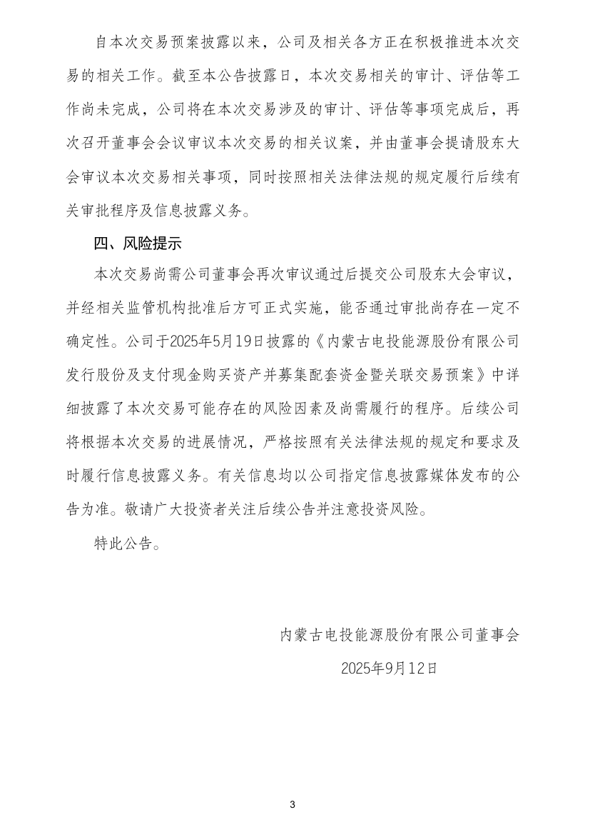 自本次交易預(yù)案披露以來,電投能源及相關(guān)各方正在積極推進(jìn)本次交易的相關(guān)工作。截至本公告披露日,本次交易相關(guān)的審計(jì)、評(píng)估等工作尚未完成,電投能源將在本次交易涉及的審計(jì)、評(píng)估等事項(xiàng)完成后,再次召開董事會(huì)會(huì)議審議本次交易的相關(guān)議案,并由董事會(huì)提請(qǐng)股東大會(huì)審議本次交易相關(guān)事項(xiàng),同時(shí)按照相關(guān)法律法規(guī)的規(guī)定履行后續(xù)有關(guān)審批程序及信息披露義務(wù)。
