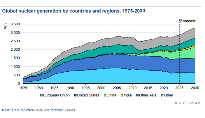 預(yù)計到2030年,中國的核電發(fā)電量將平均每年增長近6%,而美國和歐盟的核電發(fā)電量將保持基本穩(wěn)定。因此,預(yù)計中國在全球核電中所占份額將從2025年的17%上升到2030年的20%,而美國的份額將從29%下降到25%,歐盟的份額將從23%下降到20%。盡管這些份額有所下降,但增加核電發(fā)電量仍然是一項重大舉措。