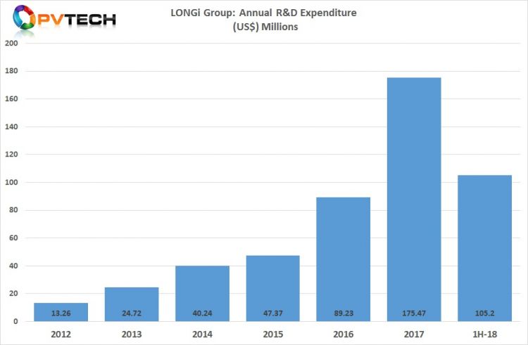 根據PV Tech對主要光伏制造商研發支出趨勢的年度分析,LONGi集團是2017年最大的消費者,超過1.75億美元的研發活動。該公司已于2018年在研發活動上花費超過1.05億美元。