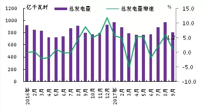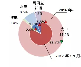 ⊙火電發(fā)電量為6433億千瓦時(shí),同比回落1.8%,占總發(fā)電量的82.7%,份額比2016年減少2.7個(gè)百分點(diǎn);