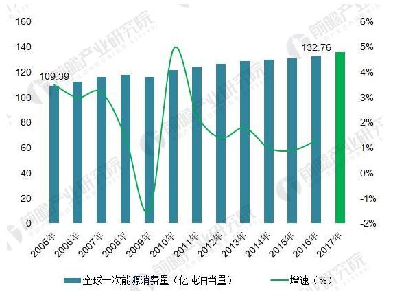 圖表4:2005-2017年全球一次能源消費總量及增速(單位:億噸油當量,%)