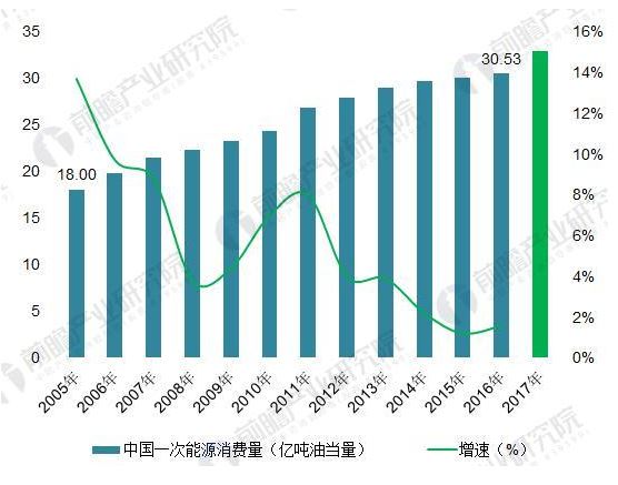 圖表5:2005-2017年中國大陸一次能源消費總量及增速(單位:億噸油當量,%)